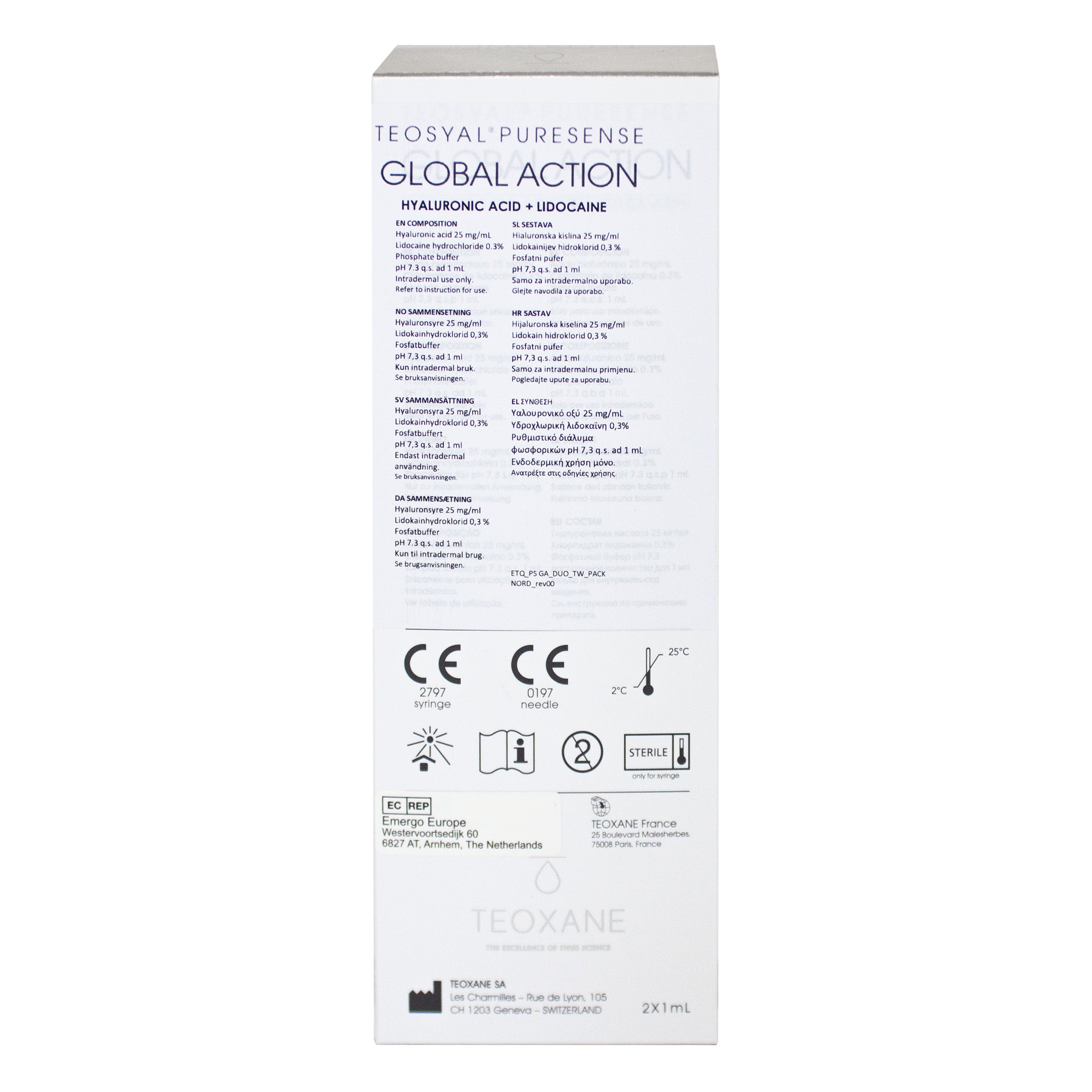 Teosyal Global Action Puresense 2×1 ml is a professional dermal filler ideal for treating fine to moderate wrinkles and improving skin quality. Its hyaluronic acid formula delivers hydration, smoothness, and elasticity, while lidocaine enhances comfort for a refined and natural aesthetic result.